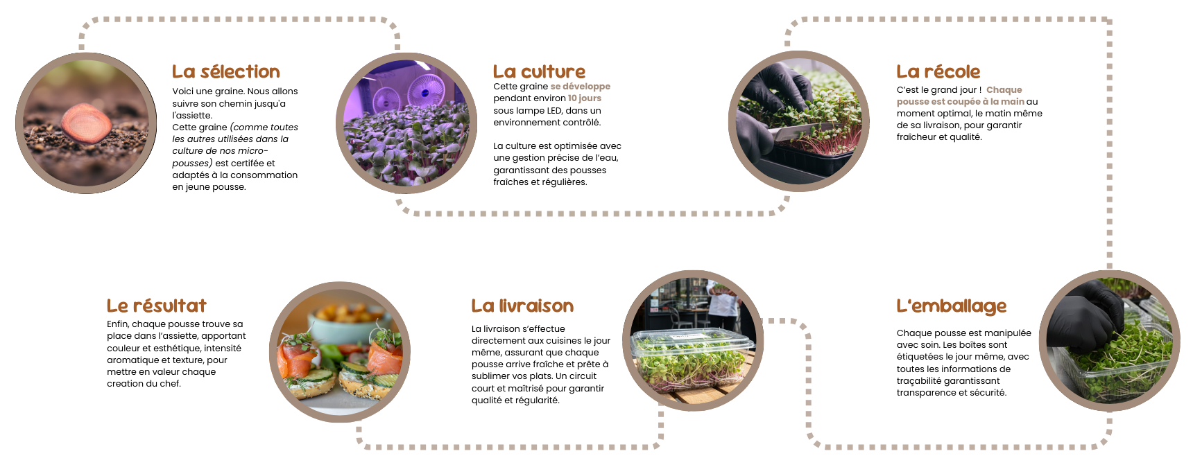 Nos micro-pousses apportent fraîcheur, intensité aromatique et précision visuelle aux assiettes des professionnels.